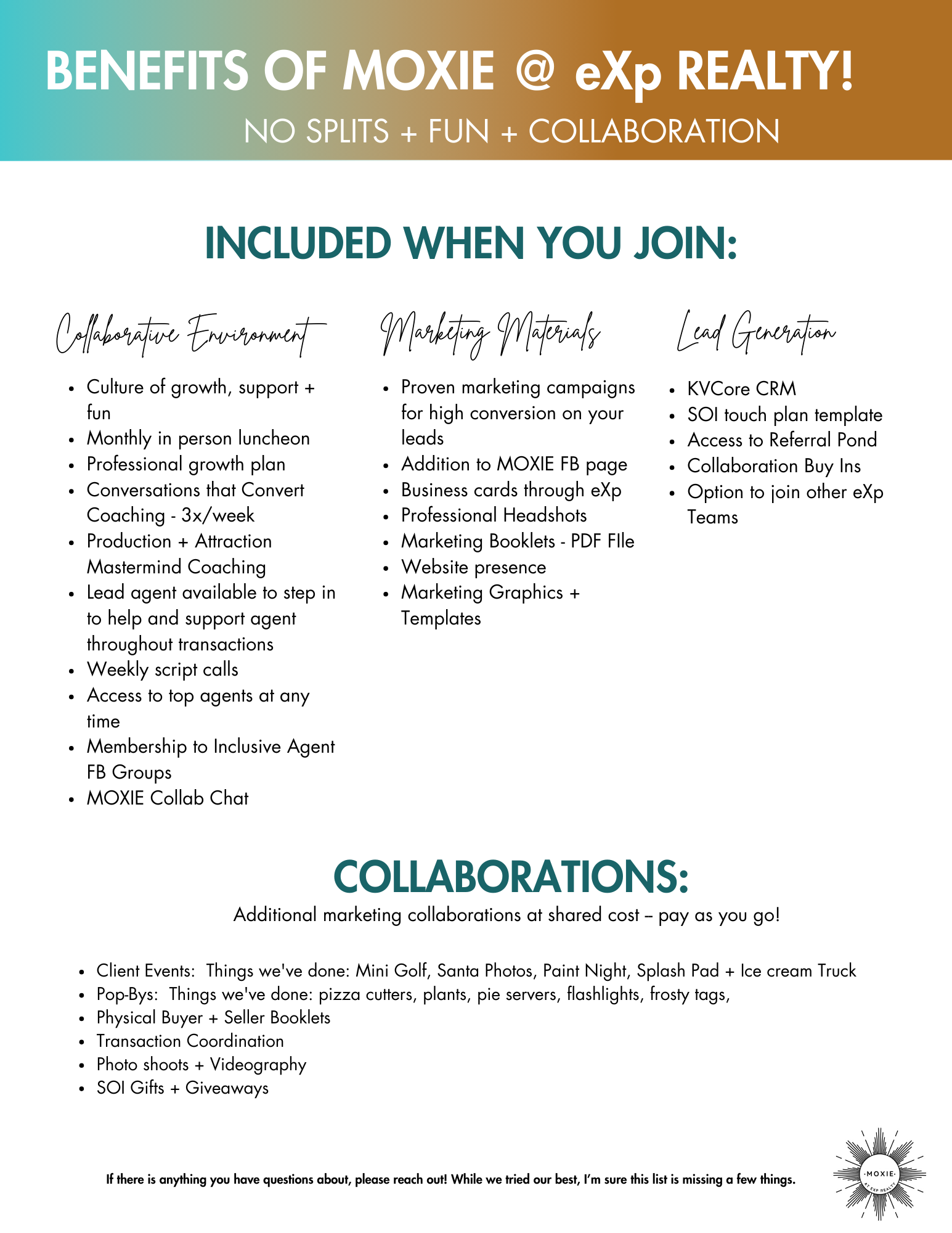 We created Moxie because we wanted a landing place for other rock star agents that were feeling alone. Too many agents join a team and give up commissions for culture. What if we could create the culture and community for free?